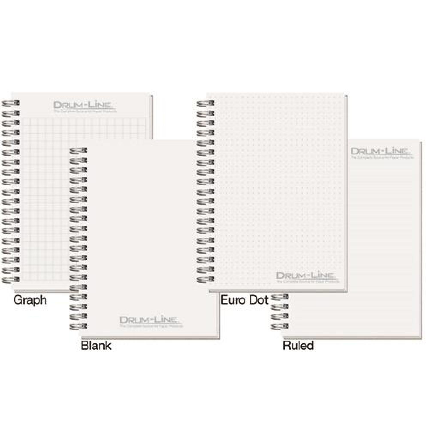 Our Impression Journal features a white 15 pt. front cover with a protective gloss coating and a durable, thick 50 pt. stock black back cover unless otherwise specified. Includes 80 pages of recycled 60 Lb. white offset inside sheets with black logo and rules, graph, or euro dot printed on the front of each sheet. Recycled symbol is printed in the lower right corner and the back of each sheet is blank. Comes Wire-O bound on the left side in black with a 3 year calendar insert. 5″ W x 7″ H