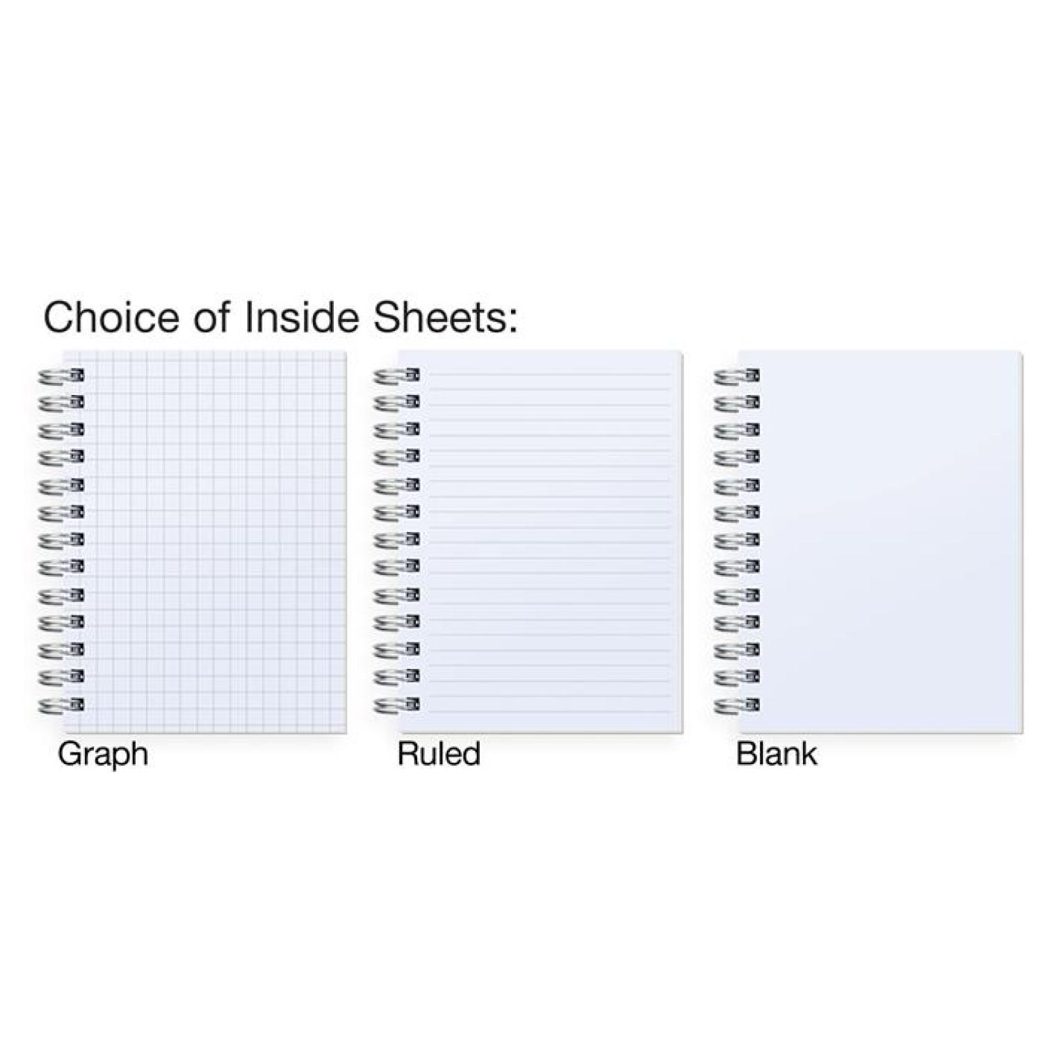 Our Gallery Journal features a 30 pt. translucent poly cover with an 80 Lb. insert sheet showing through and a heavy black paperboard back cover. Includes 60 Lb. white offset inside sheets with light gray rules or graph printed on both sides. Comes Wire-O bound on the left side. 7″ W x 10″ H