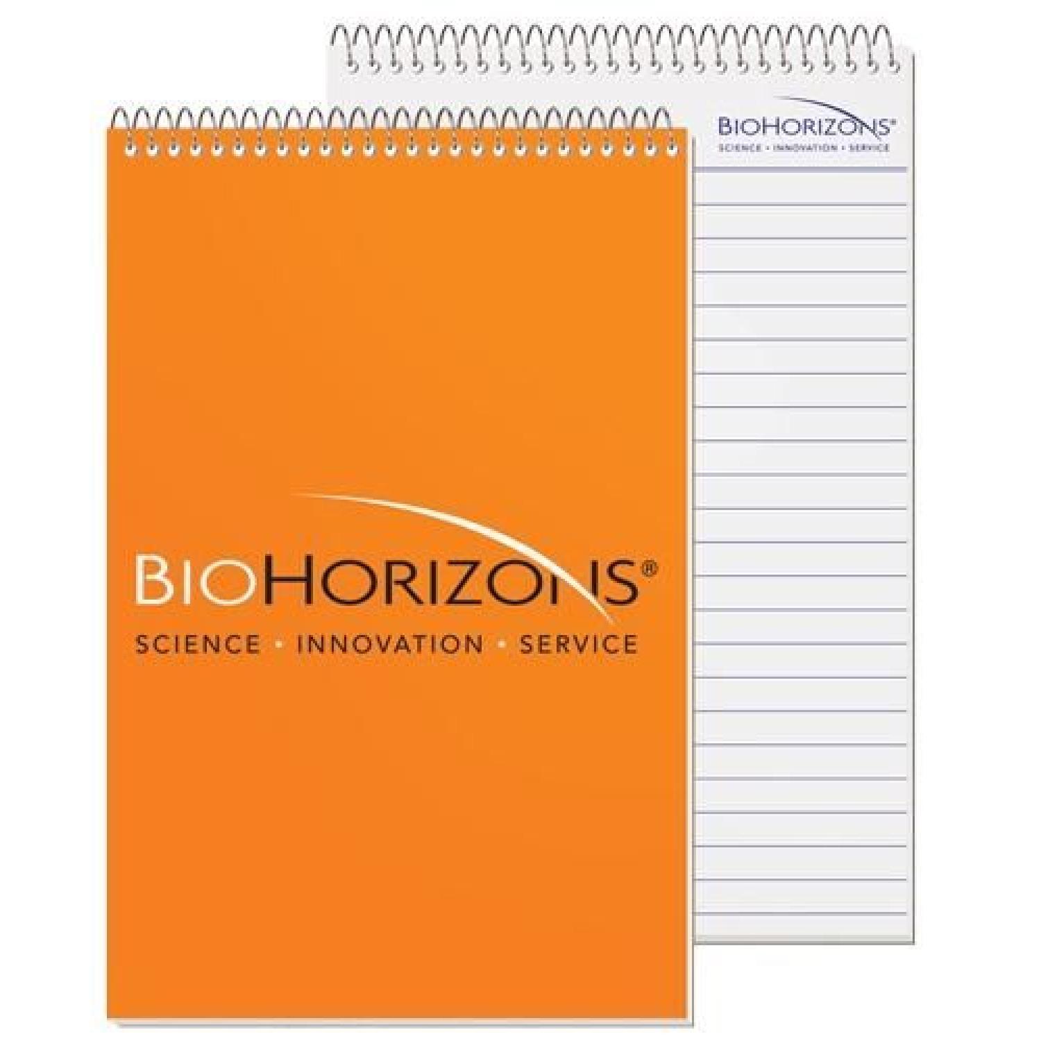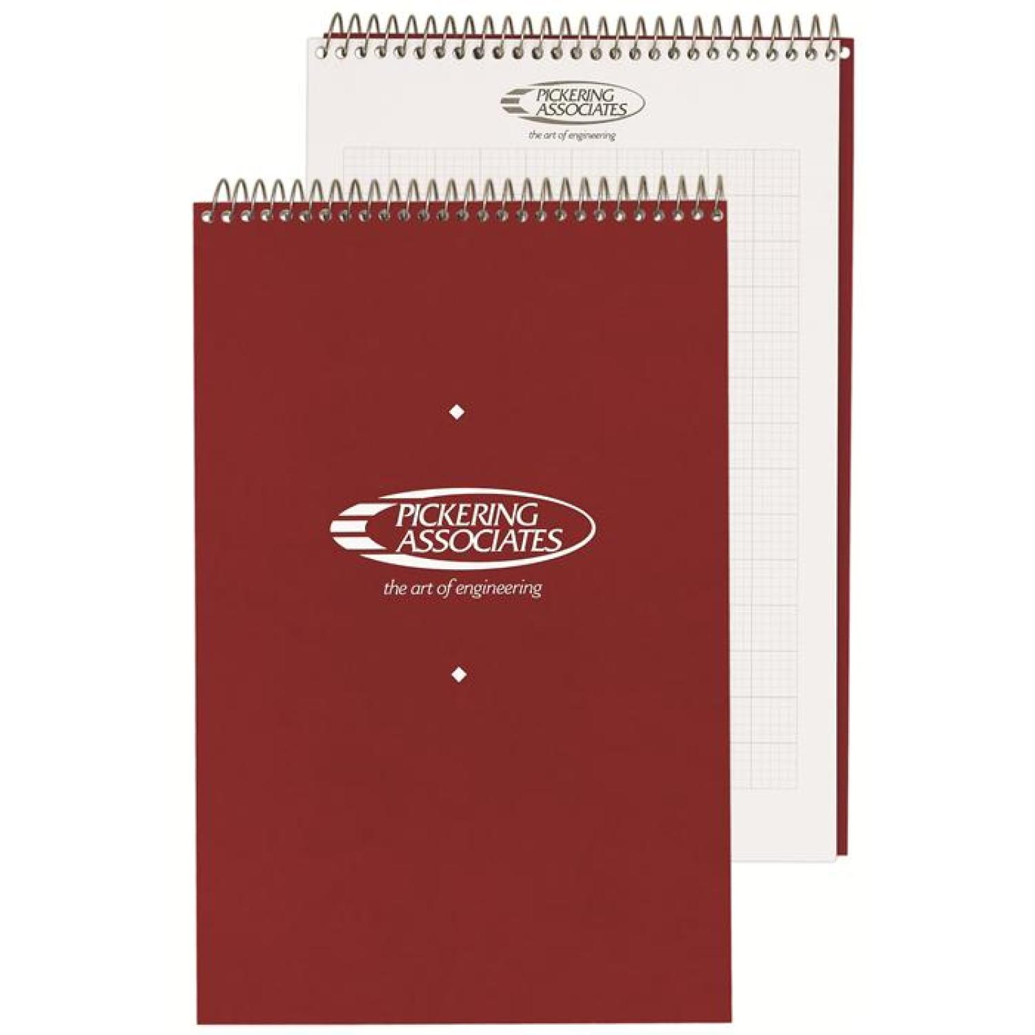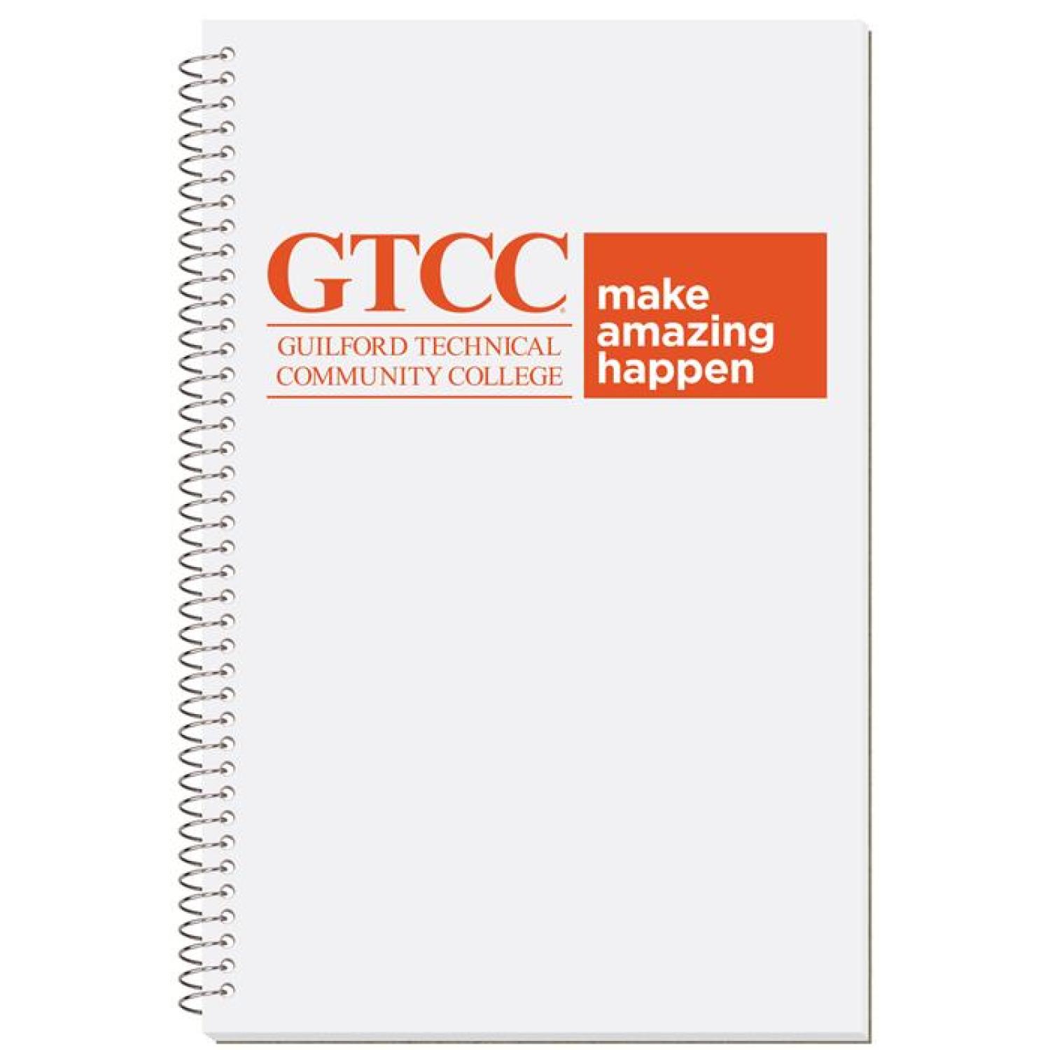 This notebook features a white 15 pt. front cover that is spot printed with a clear coat on 1 side and a white heavyweight 24 pt. back cover that is coated on 1 side. Back imprint is available on white 15 pt. only. Includes 50 Lb. white offset sheets with rules and a custom logo printed on 1 side of each sheet in 1 color. Comes coil bound on top or side, please specify. 5 3/8″ W x 8 1/4″ H