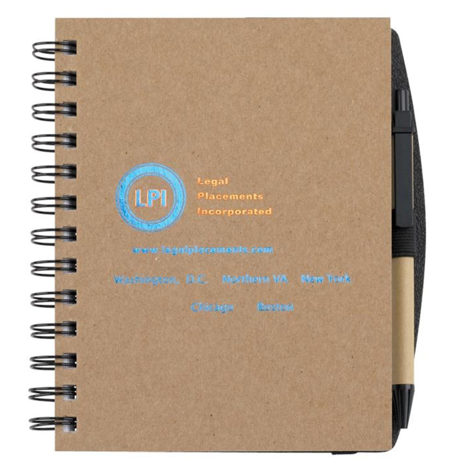Our Recycled Journal features a heavyweight Natural Brown or Gray cover with 100% post-consumer recycled content and heavyweight Black, Blue, or Charcoal Gray cover with 30% post-consumer recycled content mounted to 100% post-consumer recycled black chipboard back. Includes ruled, recycled 60 Lb. white offset sheets with a recycled symbol printed on both sides in the lower right corner. Comes Wire-O bound on the left side with a pen safe back, elastic pen loop, and brown cardboard pen. 5″ W x 7″ H