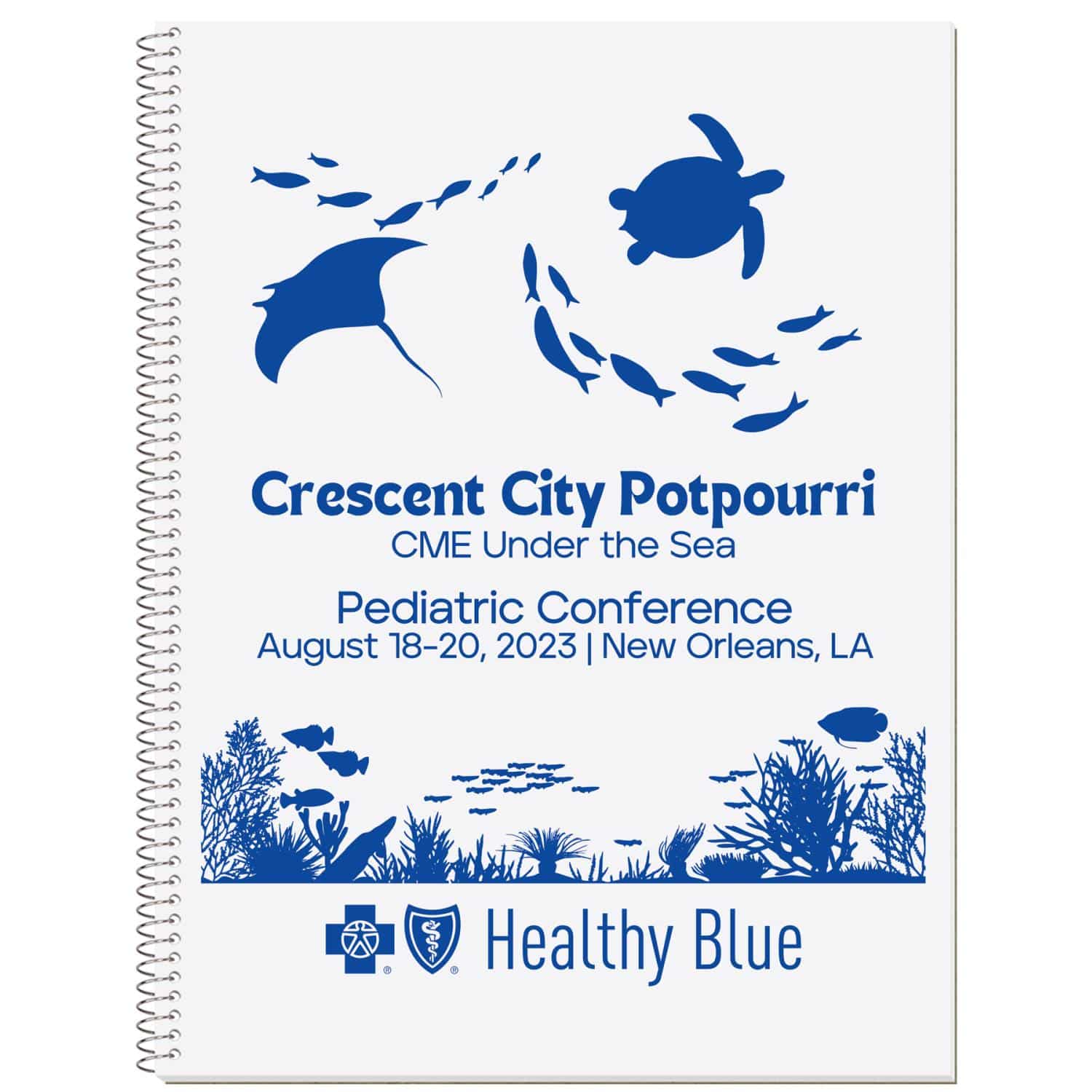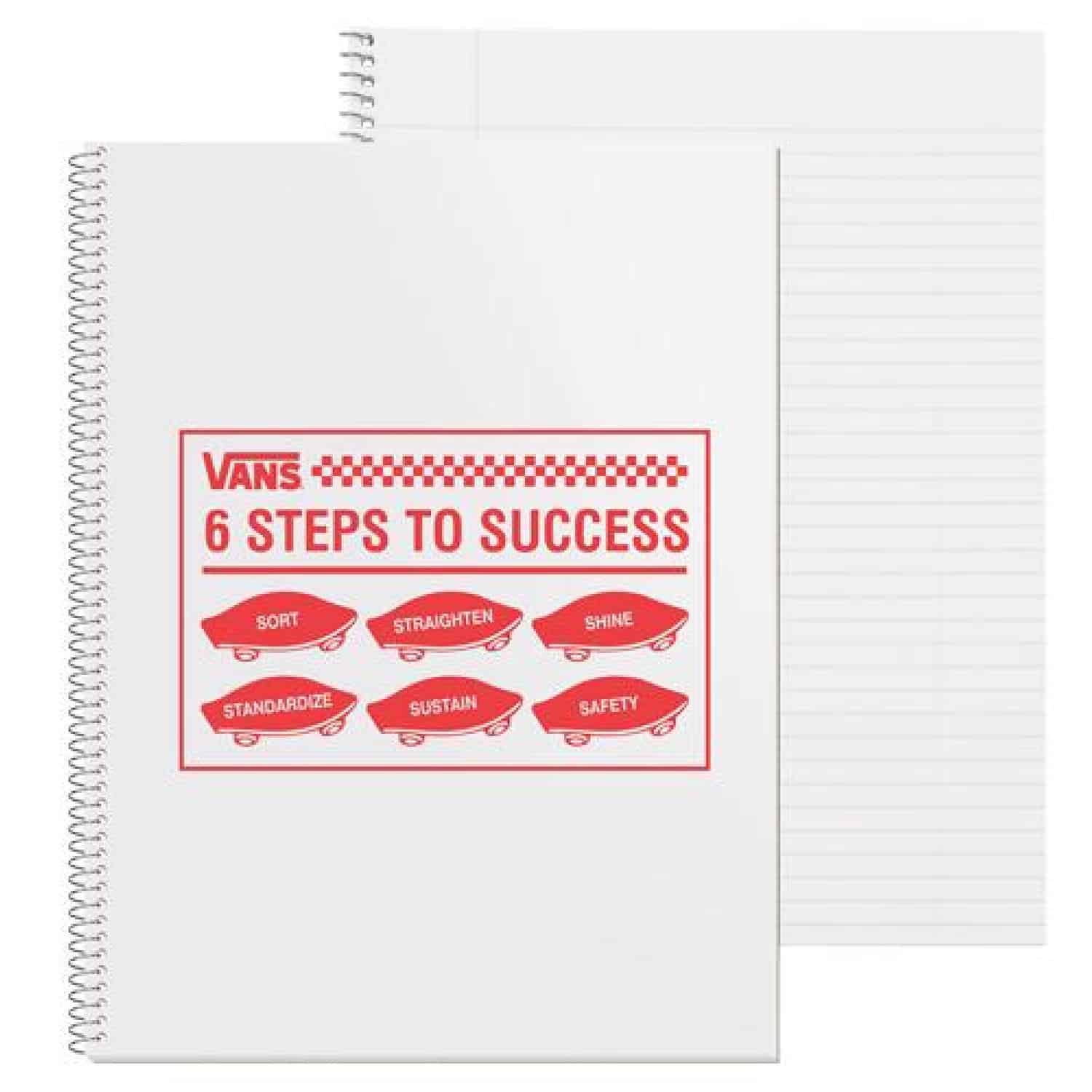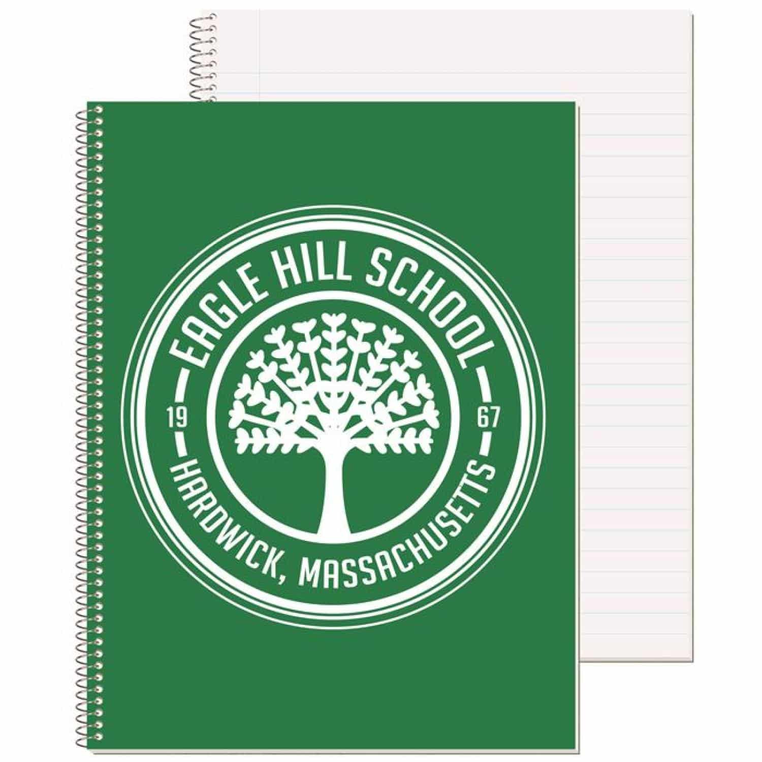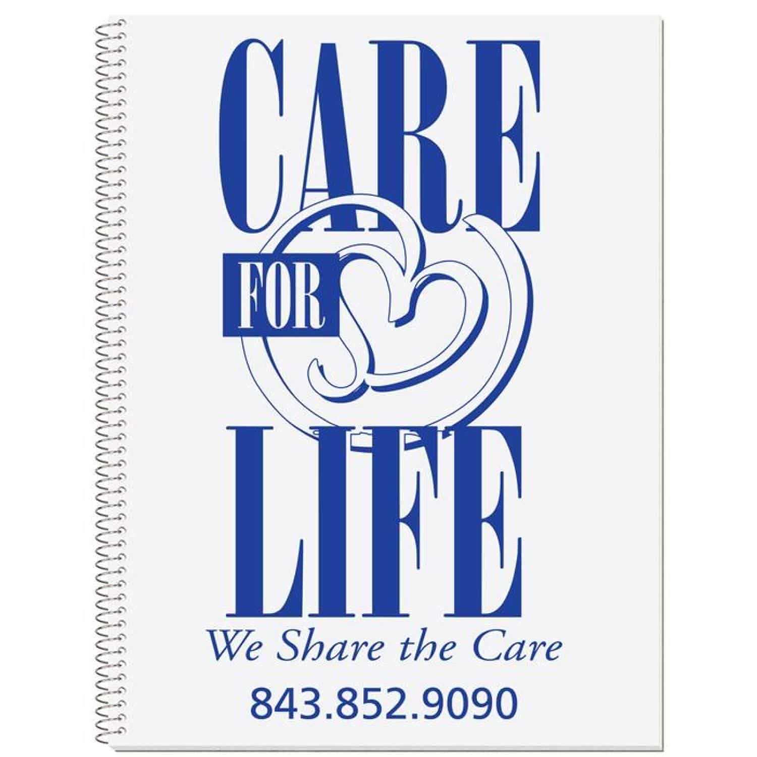 This note book has 11/32″ wide rule paper. The white 10 point cover is printed in one standard color with a clear coat. Back cover is 30 point white one side chipboard. Inside contains 50 sheets, 18 Lb. white tablet bond with light blue rules on both sides, wide rule spacing. It’s coil bound on 10½” side. 8 1/2″ W x 10 1/2″ H
